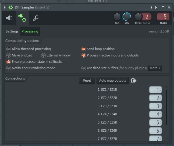 5. Jika sudah, tunggu sebentar sampai ezdrummer meload semua filenya. Setelah selesai load, sekarang caranya agar komponen drum tersebut bisa masuk ke mixer fl studio adalah dengan klik menu setting pada ezdrummer dan pilih processing seperti gambar berikut ini :